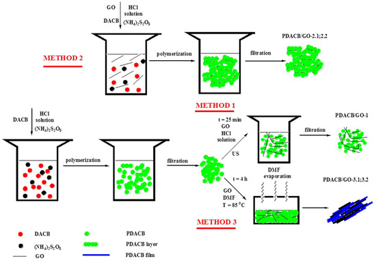 Three methods for the preparation of composites based on PDACB and a GO are shown in Scheme 1.
