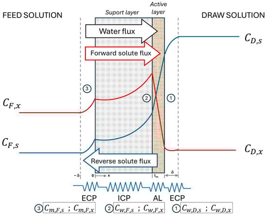 As shown in Figure 1, the direct solute flux is in the same direction as the water flux and, thus, the ECP at the FS side is a concentrative process. The solute molecules are more retained than the water molecules and the solute concentration increases at the feed membrane layer. The concentrative ECP can be expressed as follows: