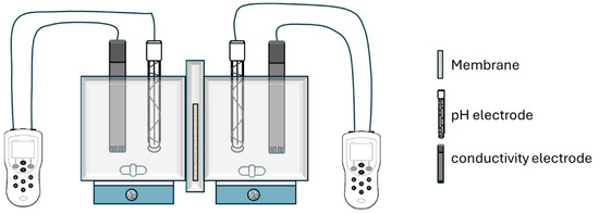 The experiments were conducted in a dead-end bench-scale cell, which consists of two cubic chambers with a capacity of 1 L that are connected through the 50 cm2 FO membrane (Figure 2). The chambers were perfectly sealed to avoid ammonia volatilization and they were agitated vigorously with a magnetic stirrer to minimize the effect of the ECP. One chamber was filled with 0.750 L of the FS and the other chamber was filled with 0.500 L of the DS and the conductivity and pH electrodes were placed in both chambers. All experiments were conducted in the PRO mode, where the membrane active layer was in contact with the DS.