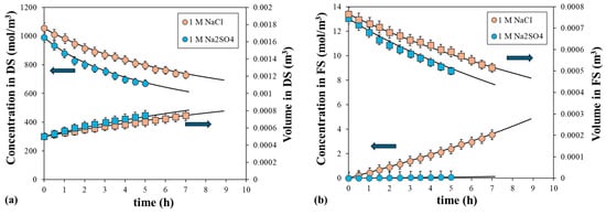 Comparison of the calculated and experimented solute concentrations and volume over time in the (a) DS and (b) FS, with 1 M NaCl or 1 M Na2SO4 as the DS and water as the FS. Symbols correspond to the experimental data (squares to volume and circles to solute concentration) and lines to the calculated data. Error bars represent the standard deviation.