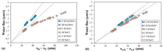 Figure 4b shows that the water flux increased almost linearly with an increasing osmotic pressure difference at the membrane surface, which was calculated by considering the significant effect of the dilutive ECP in the DS. This means that the solute concentration at the membrane surface was much lower than in the bulk solution. The effect of the ECP was more evident at high salt concentrations, such as 2 M NaCl, resulting in an increased water flux that enhanced dilution at the membrane surface [36]. At high salt concentrations, the water flux did not exactly follow a linear relationship. This deviation may indicate a modification in the water permeability coefficient due to the increase in the salt concentration inside the membrane. Other studies have observed this and attributed it to an increase in the significance of the ICP or some osmotic deswelling of the membrane [39].