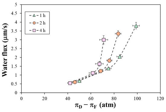 The ICP can be assessed by increasing the salt concentration in the FS and positioning the active layer to be in contact with the DS. Consequently, the diffusion of the salt into the porous layer gains significance, thereby altering the osmotic driving force. For this purpose, we conducted experiments exposing the support layer to an increasing NaCl feed concentration (0, 0.25, 0.5, and 1 M), while a 2 M NaCl solution was placed against the active layer. Figure 5 shows the water flux as a function of the bulk osmotic pressure differences at three different operation times. The highest water flux was associated with pure water as the FS, while the bulk osmotic pressure difference decreased significantly over time. As the initial salt concentration in the FS increased, the water flux decreased rapidly non-linearly due to the ICP. In addition, the variation in the osmotic pressure difference with time was less significant. Therefore, the dilutive ICP was primarily responsible for a much lower than expected water flux [36]. Similar results were obtained by Gray et al. [40]. They also analyzed the ICP by placing the active layer in contact with the FS, but they found a linear relationship between bulk osmotic pressure differences and water flux.
