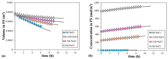 Comparison of the fitted and experimental (a) volume and (b) solute concentration in the FS, with 0, 0.25, 0.5, or 1 M NaCl as the FS and 2 M NaCl as the DS. Symbols correspond to the experimental data and lines to the calculated data. Error bars represent the standard deviation.