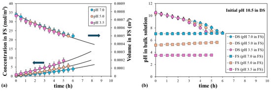Evolution of (a) volume and solute concentration in the FS and (b) pH of the bulk FS over time, with 2 M NaCl at pH 10.5 as the DS and water at different initial pH values as the FS. Error bars represent the standard deviation.