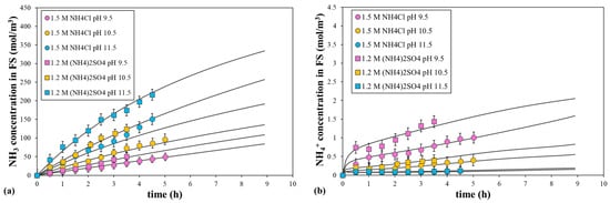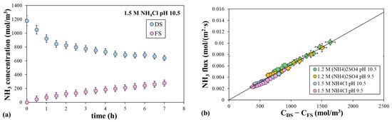 Wastewaters are complex fluids made up of organic and inorganic compounds, including valuable molecules like ammonium salts [1]. For simplicity, total ammoniacal nitrogen (TAN) is defined as the sum of both the ammonium ion and ammonia. The ammonia/ammonium ratio is determined by the acid–base equilibrium that has a pKa value of 9.24. TAN is found in various types of wastewaters, including domestic, municipal, industrial, and livestock streams [2]. Treatment methods often focus on TAN removal using chemical processes like chlorination and electrochemical oxidation [3,4], biological processes like ammonium enzymatic conversion, and bioelectrochemical systems [5,6]. Physical processes like ammonia stripping, adsorption, ion exchange, and reverse osmosis are also used for TAN recovery [7,8].
