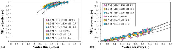 The ratio of ammonia/ammonium ion content increases as the solution pH increases through the addition of chemicals, enhancing the permeation of TAN. Ammonia is a neutral molecule with a similar size to that of the water molecule and can diffuse easily across FO membranes. Therefore, ammonia can be recovered at a pH above 9 [24]. However, only a few studies have analyzed the use of FO membranes for simultaneous ammonia and water recovery in a process with low energy consumption. Ammonia recovery was studied in hydrolyzed urine that has a high ammonia content, showing a recovery value of around 50% [25]. Ray et al. (2024) achieved a recovery rate of 86% through strategic pH manipulation by keeping the DS pH < 6.5 and the FS pH > 11 [26].