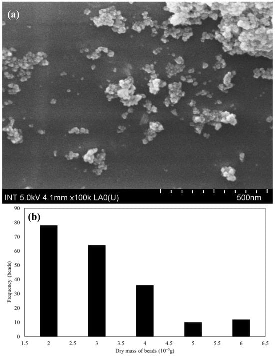 This distribution analysis in Figure 3b revealed that the majority of the synthesized beads had a mass ranging between 0.002 and 0.004 g after undergoing the drying process. These beads were presented in significant quantities, indicating a relatively uniform synthesis process. However, a smaller subset of the beads exhibited a mass between 0.005 and 0.006 g. The variation in bead mass can be attributed to the dissolution and distribution behavior of the SPIONs during the synthesis. During the sonication process involving the M8C polymer blend and SPIONs, the typically insoluble SPION particles became well-dispersed throughout the mixture. This effective dispersion ensured that each droplet of the mixture, when introduced into the NaOH solution, incorporated a consistent amount of SPIONs, thereby increasing its mass.