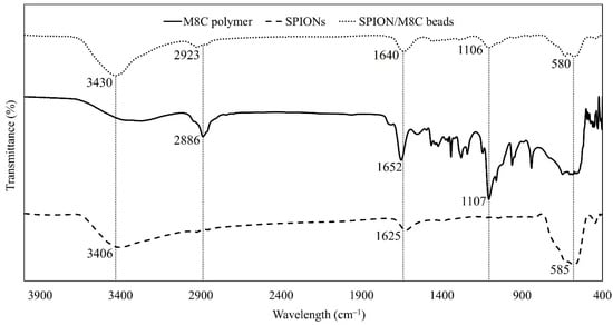 FTIR proves to be a useful tool for quantifying and identifying the functional groups within nanoparticles, thus confirming the material’s final structure. Following the synthesis of SPION/M8C beads, the sample underwent FTIR analysis, as shown in Figure 4.