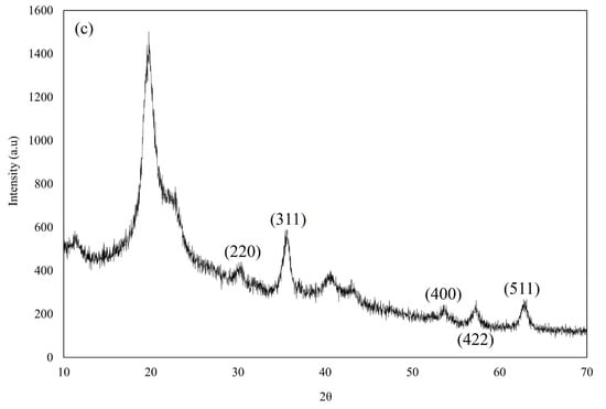 Figure 5b displays X-ray diffractograms showcasing distinct peaks located at specific angles such as 30.47°, 35.76°, 53.85°, 57.41°, and 63.01° [11]. These peaks, characteristic of magnetite, served as significant evidence indicating the nanoparticles’ composition as SPIONs. Similarly, in Figure 5c, the X-ray diffractograms of SPION/M8C beads exhibited notable peaks at angles of 30.05°, 35.53°, 53.60°, 57.18°, and 62.83° [11]. These pronounced peaks strongly suggest the presence of iron within the SPION/M8C bead composite, reinforcing its composition analysis.