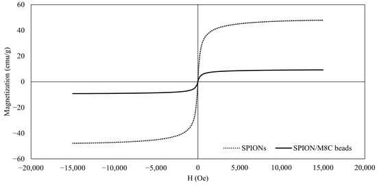 The magnetic properties of both SPIONs and SPION/M8C beads were assessed using VSM at room temperature. Across all samples, the magnetization curves exhibited characteristic S-shaped profiles in response to the applied magnetic field, with no observable remanence or coercivity. These findings were indicative of superparamagnetic behavior across the board. Specifically, the magnetization curve depicted in Figure 6 for SPIONs showcases this superparamagnetic behavior. Furthermore, the saturation magnetization values, averaging around 51 emu/g, aligned closely with approximately 54% of the bulk magnetite content [58].
