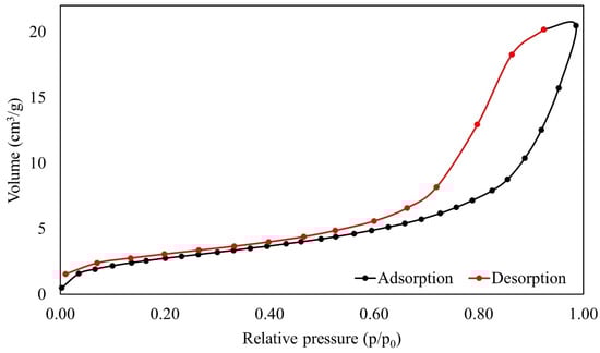 The volume of adsorbate uptake initiates at a relative pressure and gradually rises with higher relative pressures, as shown by the adsorption–desorption isotherm, as described in Figure 7. This pattern shows how the adsorbate and the adsorbent interact dynamically over a variety of pressures, increasing the material’s ability to retain the adsorbate as the relative pressure rises.