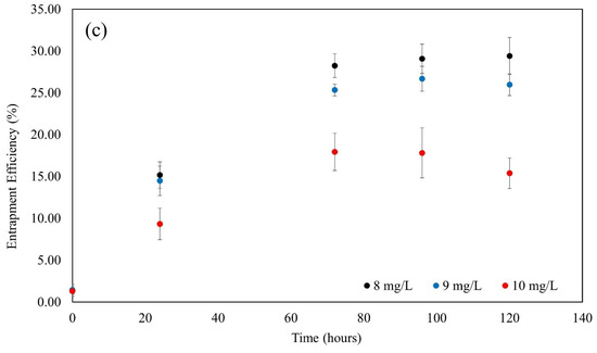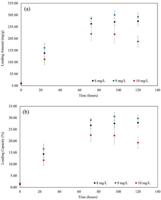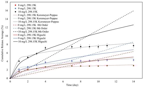 As shown in Equations (1)–(19), the loading amount (Qt), loading capacity (%LC), entrapment efficiency (%EE), adsorption kinetics models (pseudo 1st order—PFO, pseudo 2nd order—PSO), intraparticle diffusion, Elovich kinetic model, and desorption models (0th order, Higuchi, and Korsmeyer–Peppas) were used to fit the experimental data similar to previous publications [25,51].