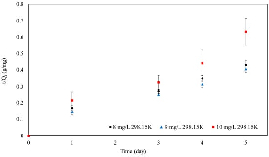 The release percentage of MB rose with increasing initial MB loading concentration. While the maximum release percentage was recorded at an initial concentration of 10 mg/L of MB, the trend indicated that increasing the initial MB concentration typically resulted in a greater release percentage. Additionally, the desorption kinetics were examined to investigate the desorption process, as shown in Figure 14.
