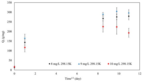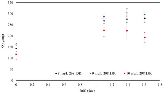 Figure 13 and Table 6 exhibit substantial R2 values from the Elovich model, indicating energy heterogeneity at the adsorbent surface. The R2 values of 0.95, 0.93, and 0.71 for MB concentrations of 8 mg/L, 9 mg/L, and 10 mg/L, respectively, confirm a strong fit for the model, particularly at lower concentrations.