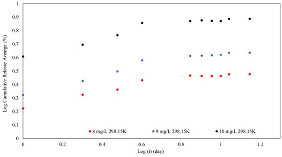 Even though the release of MB occurred at a constant temperature and a pH of 3.85, the release percentage of MB varied depending on initial loading conditions, such as temperature and starting MB concentration, as demonstrated in Table 7.