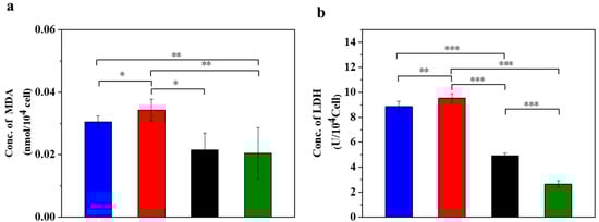 After 24 h of cultivation, cells were trypsinized as previously described and MDA and LDH concentrations were quantified using a colorimetric method [28]. All procedures were performed in strict compliance with the reagent kit instructions.
