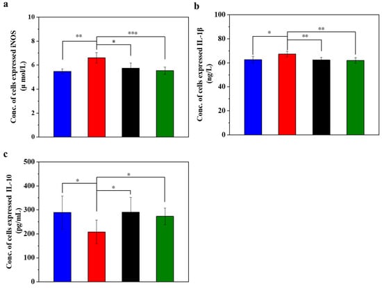 Cell suspensions were prepared using the above method and then randomly assigned to the normal control group, the negative control group, the UC-MSC repair group and the UC-MSCs + hydrogel repair group. The cells were then inoculated into a 96-well plate and incubated in a CO2 incubator for 24 h. After culturing, the cell supernatant was collected and the levels of iNOS, IL-1β and IL-10 were determined by radioimmunoassay according to the kit instructions [31,32,33].
