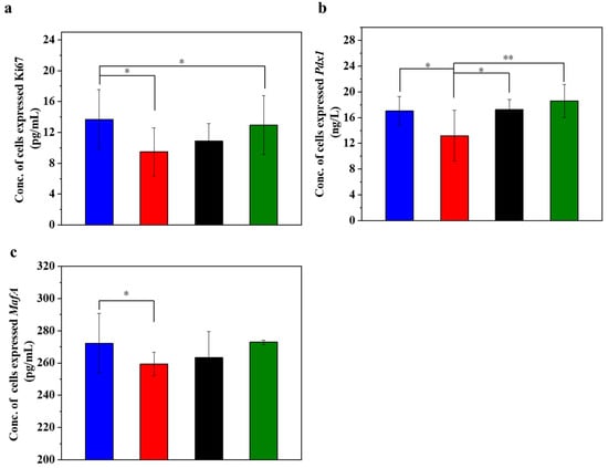 Figure 4 displays the different expression levels of cell proliferation markers in the injured MIN-6 cells of various experimental groups. Ki67 is a cell proliferation marker whose expression level is higher in actively proliferating cells. In islet cells, the expression level of Ki67 may reflect the proliferation activity of islet β-cells [53,54]. When the expression level of Ki67 in the cells was determined (Figure 4a), it was found that the expression level of Ki67 decreased significantly in the STZ-damaged group compared to the normal control group (p < 0.05). In contrast, the expression of Ki67 significantly increased in the group with UC-MSCs + hydrogel (p < 0.05), suggesting that UC-MSCs + hydrogel can protect MIN-6 cells from STZ injury and improve their function. Pdx1 is an important transcription factor of islet cells, which is crucial for islet cell development and function. Pdx1 promotes the differentiation of islet precursor cells into islet cells during early embryonic pancreatic development and continues to regulate islet cell maturation and function at subsequent stages of development, specifically promoting islet β-cell maturation and insulin secretion [53,54]. The expression of Pdx1 may reflect the functional status of β-cells, as observed in our study, where the expression of Pdx1 (Figure 4b) was significantly downregulated in the STZ injury group compared to the normal control group (p < 0.05). Conversely, the expression of Pdx1 was increased in the UC-MSC repair group and the UC-MSCs + hydrogel repair group, suggesting that UC-MSCs + hydrogel significantly increased the proliferation activity of MIN-6 cells. MafA plays an important role in pancreatic islet cell differentiation and function. MafA is also involved in the migration of pancreatic progenitor cells to the maturation process of β-cells. It is involved in the regulation of insulin gene transcription and promotes insulin synthesis and secretion. MafA is involved in the stress response of islet cells and is an important regulator of the stress response of islet β-cells to hyperglycemia and insulin resistance [55]. Based on the Ki67 and Pdx1 results, we detected the expression of MafA in MIN-6 cells as shown in the figure (Figure 4c). The results showed that the expression of MafA was higher in the UC-MSC repair group and the UC-MSCs + hydrogel repair group compared with the STZ injury group, suggesting that UC-MSCs + hydrogel can repair the function of MIN-6 cells and increase their proliferation activity. The composite hydrogel facilitated the optimal paracrine action of UC-MSCs and enhanced the proliferation of MIN-6 cells, which held significant implications for the repair of β-cells in T2DM [8,9].