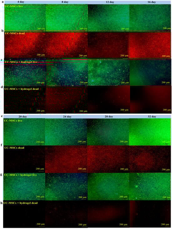 To evaluate the effect of UC-MSCs + hydrogel on the survival of MIN-6 cells, the staining of live and dead cell was performed in this study. Figure 6 shows that a large number of cells survived in the UC-MSC repair group during the 32-day experiment. However, the number of dead cells was higher than in the UC-MSCs + hydrogel repair group. Moreover, a considerable number of UC-MSCs survived within the hydrogel of the UC-MSCs + hydrogel repair group, and the MIN-6 cells co-cultured with UC-MSCs + hydrogel also showed a high survival rate. The UC-MSCs + hydrogel repair group showed less cell death compared to the UC-MSC repair group. In addition, the UC-MSCs + hydrogel repair group did not exhibit high cell density, leading to cell floating, which was probably due to the encapsulation effect of the hydrogel on UC-MSCs. The adequate porosity of the hydrogel provides more space for cell survival [58,59]. There was a significant difference between the UC-MSC repair group and the UC-MSCs + hydrogel repair group (p < 0.001), and the interaction effect was also statistically significant (p < 0.001). This suggests that the approach of using stem cells encapsulated in hydrogels in combination with T2DM may reduce the need for stem cells and mitigate the risk of tumorigenicity associated with stem cells.
