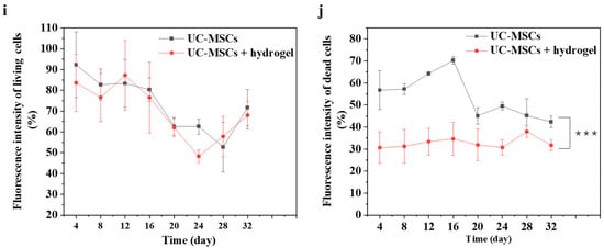 UC-MSCs + hydrogel enhanced long-term survival of injured MIN-6 cells. (a,b) UC-MSCs + MIN-6 group live cell staining and dead cell staining. (c,d) UC-MSCs + MIN-6 + hydrogel group live cell staining and dead cell staining. (e,f) UC-MSCs + MIN-6 group live cell staining and dead cell staining. (g,h) UC-MSCs + MIN-6 + hydrogel group live cell staining and dead cell staining. (i) Dead cell count. (j) Living cell count. The intergroup comparison was applied by one-way analysis of variance (ANOVA), in which asterisks indicated the difference from the control group (*** p < 0.001).