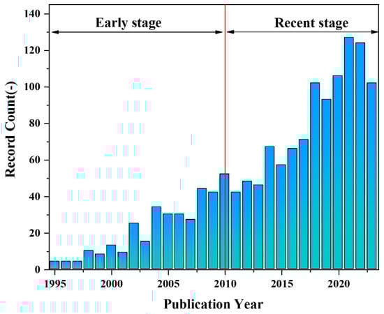 The PLA membrane can undergo complete degradation by microorganisms in the natural environment, making it a renewable and environmentally friendly material for various applications. Additionally, it exhibits excellent strength, processability and favorable biocompatibility, rendering it highly promising for tissue engineering [,,], vascular transplantation [,,], drug carrier [,,], and other fields [,,,]. Zhong et al. [] utilized PLA, nano-SiO2 and a mixture of good and poor solvents to fabricate superhydrophobic PLA film with nano/microstructured morphology using the non-solvent-induced phase separation (NIPS) method. The maximum water contact angle achieved was 164° ± 2.3°. The high hydrophobicity of the membrane holds significant potential in the realm of oil-water separation Liu et al. [] immobilized a polydopamine (PDA) biological coating and silver nanoparticles (AgNPs) onto the membrane surface, followed by hydrophobic treatment with fluorinated mercaptan, resulting in the successful construction of a hierarchical rough structure of PLA. The water contact angle on the PLA membrane surface reached 158.6°, achieving a maximum permeate flux of 2664 L/(m2·h). Moreover, the separation efficiency for oil-water mixtures and water-in-oil emulsions exceeded 98.4%, demonstrating excellent stability and antibacterial properties. Hu et al. [] utilized electrospinning technology to fabricate a composite nanofiber scaffold consisting of PLA, hydroxyapatite (HA), and polydopamine (PDA). Their findings revealed that the incorporation of HA-PDA particles significantly enhanced the hydrophilicity of the scaffold material. Moreover, compared to pure PLA nanofibers, the PLA/HA/PDA composite nanofiber scaffolds exhibited notably improved cell adhesion rate and survival rate. Consequently, these biocompatible (PLA)/HA/PDA composite nanofibers hold great potential as scaffolds for bone tissue engineering. Zhou et al. [] employed electrospinning technology to fabricate a three-dimensional network structure of PLA/Polypyrrole (PPy) nanofiber scaffolds. In vitro experiments have demonstrated that the scaffold exhibits exceptional biocompatibility with human umbilical cord mesenchymal stem cells as well as Schwann cells, thereby enhancing their adhesion behavior. The PLA/graphene oxide (Go) drug-loaded nanofibers with different structures (single-axial and co-axial structure) were prepared by the electrospinning method, as demonstrated by Mao et al. []. A comparison of the drug release properties between PLA/Go nanofibers with different structures revealed that co-axial structure PLA/Go nanofibers exhibit enhanced stability and durability in drug release performance, effectively preventing sudden drug release. Consequently, these nanofibers hold significant potential for broad applications in the field of controlled drug release. Buscemi et al. [] connected α,β-poly(N-2-hydroxyethyl)-D,L-aspartamide (PHEA) with PLA and blended it with polycaprolactone (PCL) to formulate an electrospinning solution. Subsequently, the electrospinning technology was employed to prepare a vascular stent exhibiting excellent mechanical strength and elasticity, along with favorable biocompatibility.single-axial and co-axial structure. Scientific research reports on the properties and potential applications of PLA porous membranes have consistently increased over the past three decades, as depicted in Figure 1.