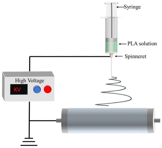 Electrospinning stands out as one of the most frequently employed techniques for producing PLA fiber membranes. The primary preparatory steps involve formulating a PLA spinning solution and subsequently injecting it into the spinning machine. The fundamental principle is to enhance the surface area of the spinning solution in order to induce an electric current through a high-voltage electric field. This leads to multiple stretching and splitting of the spinning solution during the injection process, as it shifts along a spiral path towards the receiving device for solidification into nanofibers. The overlapping of numerous fibers results in the formation of a porous film [,,]. The schematic in Figure 2 illustrates the electrospinning process. By adjusting various electrospinning factors, such as voltage, spinneret diameter, working distance between the spinneret and receiving substrate, and other polymer parameters specific to PLA electrospinning, the manipulation of the structure and properties of PLA nanofibers becomes feasible [,]. Table 1 provides a summary of electrospinning parameters and pore sizes for different PLA based polymers.