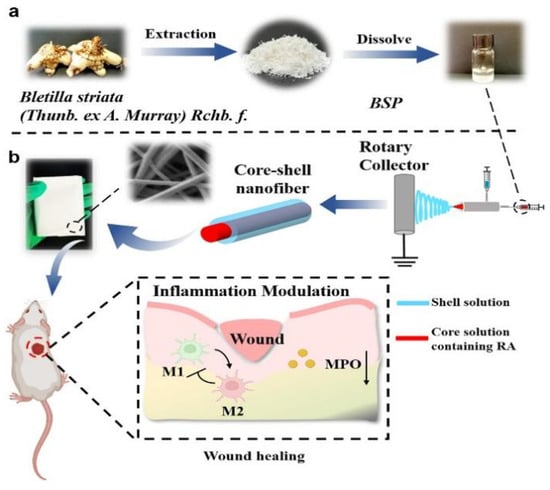 RA-BSP-PVA-PLA coaxial nano-fiber design process and schematic diagram to promote wound healing []. (a) Preparation and application of RA-BSP-PVA@PLA nanofibers, extraction and preparation of BSP. (b) Schematic diagram of preparation of coaxial nanofibers and their promotion of wound healing.