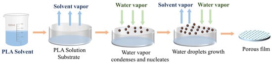The phenomenon of Breath-Figure (BF) refers to the formation of water mist on solid or liquid surfaces, which was initially discovered and reported by Francois as the self-assembly of fine-scale polymer honeycomb structures facilitated by water []. The low surface temperature of a solid or liquid induces the release of heat from water vapor in the air, leading to its condensation on the surface. Due to the growth rate and mutual forces, organized arrangements of water droplets develop, acting as templates for surrounding solid material to solidify into regular patterns. Figure 4 illustrates the fabrication process of PLA porous membranes utilizing this technique.