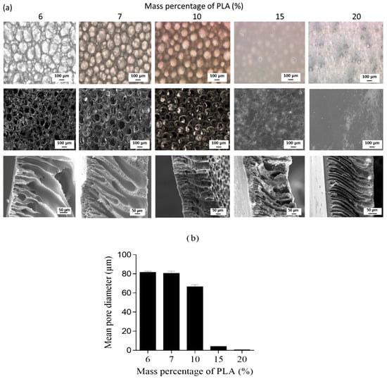 (a) Optical microscopy (top) and SEM (middle) views of the porous bottom surface and SEM views of the cross section (bottom) of PLA membranes. (b) Mean diameter (μm) of macropores open on the bottom surface of the membrane [].
