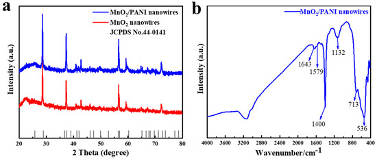 (a) XRD patterns of MnO2 nanowires and MnO2/PANI nanowires; (b) FTIR spectrogram of the MnO2/PANI nanowires.