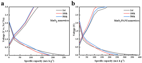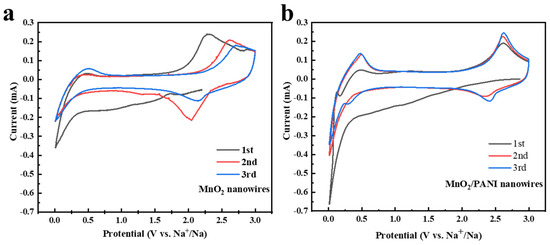 To estimate the excellent electrochemical performance of the MnO2/PANI nanowire anode in sodium-ion batteries, a coin cell was assembled. Cyclic voltammetry (CV) curves of MnO2 nanowires and MnO2/PANI nanowires are shown in Figure 6. By comparing Figure 6a,b, we can see that in the first cycle, the irreversible reduction peak appears in both graphs, corresponding to the formation of an SEI film. Since the second cycle, the peak no longer appeared, indicating that the formed SEI film was stable. After the activation of the first cathode scanning, the anode peaks of the second and third cycles completely coincided with subsequent anode–cathode scanning (Figure 6b). The peak position and peak area remained stable, indicating that the MnO2/PANI nanowire anode features a more stable cycle, high reversibility, and no attenuation of specific discharge capacity compared to MnO2 nanowires. A couple of redox peaks can be observed for MnO2/PANI nanowires at around 2.6 V/2.4 V and MnO2 nanowires at around 2.6 V/2.0 V, illustrating the migration and insertion of sodium ions. In Figure 6b, the potential value between the oxidation peak and the reduction peak is very small (0.2 V), indicating that the polarization is weak, while the potential difference in Figure 6a is large (0.6 V), indicating that the polarization is more obvious, which will accelerate the consumption of electrode materials and waste energy. In addition, the peak intensity of MnO2/PANI nanowires is larger than that of MnO2 nanowires, showing that the electrodeposition of polyaniline has better conductivity [2,9].