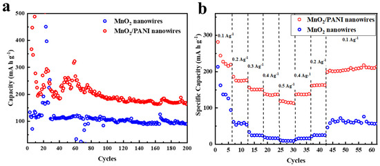 The comparison of cyclic performance between MnO2 nanowires and MnO2/PANI nanowires is shown in Figure 8a. During the initial 80 cycles, the discharge capacity decayed, and then stayed stable. The discharge capacities of MnO2 nanowires and MnO2/PANI nanowires are 90.3 mA h g−1 and 167.7 mA h g−1 after 200 cycles. MnO2/PANI nanowires manifest superior cycle ability than MnO2 nanowires. In Figure 8b, the MnO2/PANI nanowire electrode also shows a better rate performance than the MnO2 nanowire electrode. The discharge capacity of MnO2/PANI nanowires is 215.2, 174.7, 150.4, 135.2, and 114.4 mA h g−1 at current rates of 0.1, 0.2, 0.3, 0.4, and 0.5 A g−1, respectively. When the current density is switched back to 0.1 A g−1, the specific capacity can still be restored to about 200 mA h g−1, which represents more than 95% capacity recovery and shows excellent reversibility and structural stability [2,10].