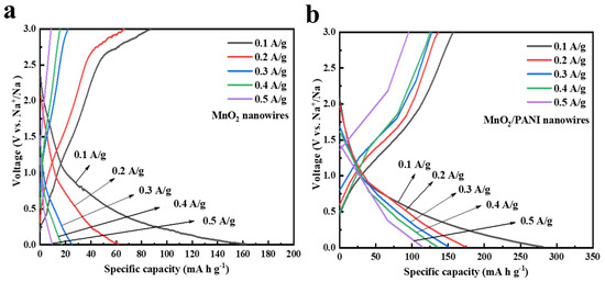 Further, the rate properties of MnO2 nanowires and MnO2/PANI nanowires samples were studied step by step from 0.1 to 0.5 A g−1. At 0.1 A g−1, 0.2 A g−1, 0.3 A g−1, 0.4 A g−1, and 0.5 A g−1 current densities, MnO2 nanowires had discharge capacities of 162.5, 61.7, 25, 16.9, and 9.5 mA h g−1, respectively (Figure 9a). At a reverse current rate of 0.1 A g−1, specific capacity returned to a value of 58.8 mA h g−1, indicating that the MnO2 nanowire capacity decline was serious, and the cycle performance and structural stability are poor. The discharge capacities of MnO2/PANI nanowires were 281.6, 174.4, 150.4, 135.2, and 114.4 mA h g−1, respectively (Figure 9b), and the specific capacity returned to a value of about 160 mA h g−1 at a reverse current rate of 0.1 A g−1. Except for the loss of capacities in the initial cycle, the discharge capacities of other current densities were consistent with those of the rate performance image [13]. In contrast, MnO2/PANI nanowires had no obvious capacity attenuation trend and had better performance, structural stability, and reversibility.