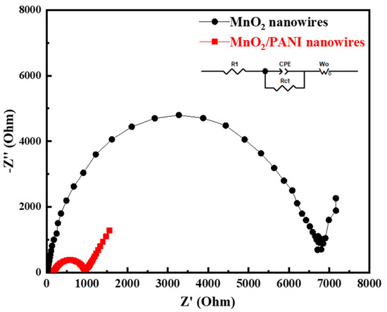 Electrochemical impedance spectra of MnO2 nanowires and MnO2/PANI nanowires.