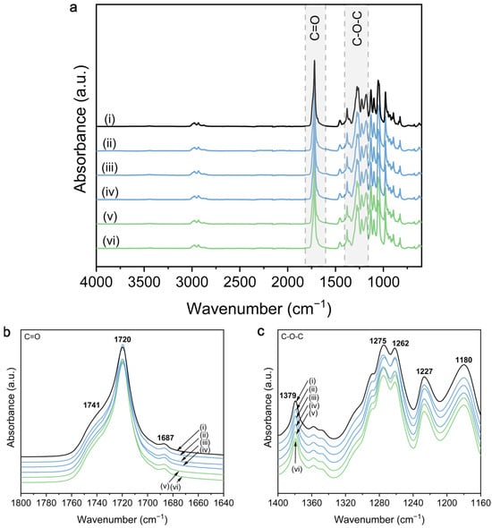FTIR spectra of PHBHHx/ZnO nanocomposites with different types of ZnO NP at a concentration of 5 wt.%, including (i) pure PHBHHx, (ii) ZnO(R), (iii) ZnO(R-Si), (iv) ZnO(R-Si-e), (v) ZnO(S-1), (vi) ZnO(S-2), with (a) overview of FTIR spectra, (b) detail of the C=O region (1800 to 1640 cm−1), and (c) detail of the C-O-C region (1400 to 1160 cm−1).