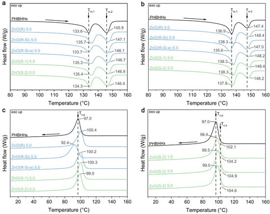 The influence of ZnO NPs on the melting and crystallization of PHBHHx was investigated with DSC. The heating and cooling scans of the PHBHHx/ZnO nanocomposite films for different ZnO types and concentrations are shown in Figure 4 and the characteristic values are shown in Table 3 and Table 4. The first and second heating scans (Figure 4a,b) and Table 3 show that the melting behavior of the PHBHHx/ZnO films is clearly defined by the multiple melting peaks of PHBHHx []. The first endothermic peak at Tm,1 originates from the melting of primary crystals formed during the initial crystallization during processing (first heating in Figure 4a) or at the single crystallization temperature (Tc) (second heating in Figure 4b) [,]. The second endothermic peak at Tm,2 is due to the melting of crystals formed by reorganization or thickening while heating in the DSC run [,]. In this way, only one well-defined crystallization peak (Figure 4c) corresponds with two endothermic melting peaks. In addition, the DSC curves of pure ZnO NP did not reveal any significant endothermic or exothermic events in the temperature range of −30 to 170 °C, as expected in agreement with previous literature []. Some changes in the heating cycles are apparent for the PHBHHx/ZnO nanocomposites. The Tm,1 and Tm,2 in the first and second heating cycles increase slightly for all ZnO types except for ZnO(R-Si), compared to neat PHBHHx. However, no significant trend of ZnO type on the crystallinity (XC,DSC) and melting enthalpy (ΔHm) is observed from DSC.