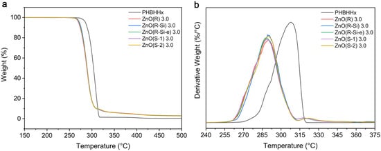 The influence of ZnO NPs on the thermal stability of PHBHHx was investigated with TGA measurements. An overview of the TGA curves for PHBHHx/ZnO with 3 wt.% ZnO loading is shown in Figure 5 and characteristic parameters for all ZnO types and concentrations are summarized in Supplementary Materials, Table S10. TGA curves for all ZnO NP types are shown in Supplementary Materials, Figure S6.