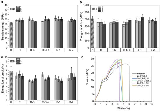 Mechanical properties of PHBHHx/ZnO nanocomposite films with different ZnO types and concentrations (1, 3, and 5 wt.%) and unfilled PHBHHx (H) films (n = 5, ±1 SD): (a) tensile strength, (b) Young’s modulus, (c) elongation at break, (d) average stress-strain curves for 5 wt.% ZnO. Bars with * denote statistical differences (p < 0.05) compared to PHBHHx.