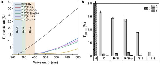 UV/VIS measurements were performed to study the UV barrier effect of the PHBHHx/ZnO nanocomposite films. The UV/VIS transmission spectra of the PHBHHx and PHBHHx/ZnO films with 5 wt.% ZnO are shown in Figure 7a. The UV/VIS spectra for 1 and 3 wt.% ZnO are shown in Supplementary Materials S11. These results show that the PHBHHx/ZnO films have significantly reduced UV transmission in the wavelength range 250 nm to 380 nm, and thus they can effectively act as a UV barrier. The ZnO NPs exhibit an absorption peak between 370 nm and 390 nm, and the UV barrier in the UVA wavelength region is highly concentration-dependent and increases with ZnO concentration (Figure 7b).