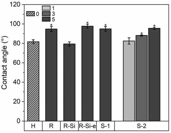 To obtain an indication of the difference in hydrophobicity between the different ZnO NP types, contact angle (CA) measurements were performed on dried ZnO films []. One mL of ZnO NP dispersions in ethanol (10 mg/mL) were drop-casted and dried on glass standard microscopy slides at 50 °C. The indicative wetting behavior of the ZnO NP layers on glass was tested by water CA measurements (sessile drops), performed with an OCA20 instrument (DataPhysics, Filderstadt, Germany) and SCA 20 software (Version V3.61.4). The D.I. water droplets of 0.5 μL were deposited on the surface using a Hamilton syringe. A droplet of 5 µL was used for the ZnO(R-Si) type because of its very high hydrophobicity. The ZnO surface area, pore volume, and pore size were examined with a TriStar II Plus analyzer (Micromeritics Instruments, Norcross, GA, USA). The ZnO nanopowders were degassed overnight under a nitrogen atmosphere at 150 °C.