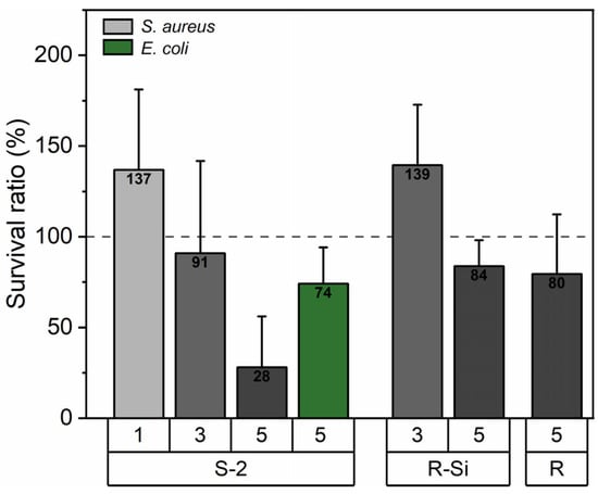 To test the antibacterial activity of the nanocomposite films, pieces of 10 mm × 10 mm of the PHBHHx and PHBHHx/ZnO films were first sterilized in ethanol for 10 min, dried for at least 30 min and placed in separate wells of sterile 12-well plates. Next, 100 µL of the normalized ONC in phosphate-buffered saline (PBS) were pipetted onto the specimen surfaces. The internal volume of the 12-well plates (between the wells) was filled with sterile water to ensure humidity. The specimens were incubated for 24 h at 37 °C. The bacteria were recovered from the film surfaces by washing each sample with 3 × 1 mL of PBS. Each specimen with its washing fluid was transferred to a falcon tube filled with 2 mL of PBS and vortexed for 30 s. Then, tenfold serial dilutions were made in PBS up to 10−5, and these dilutions were spot-plated in triplicate on LB agar plates. The plates were incubated overnight at 37 °C. The number of colonies was recorded and used to determine the number of viable bacteria (CFUs/mL) per biological origin. The survival ratio () per biological origin was calculated according to Equation (4):
