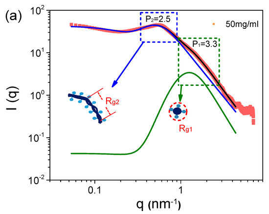The scattering profile of the 50 mg/mL S-PFSA dispersion is well fitted using Equation (3), as shown in Figure 2a. The specific sizes, Rg1 and Rg2, are identified as the lateral size and correlation length (ξ) of the colloidal particles. In the low-q region, the lateral size of the colloidal particles was calculated to be 1.3 nm, closing to ~1 nm obtained through the cylindrical model. The correlation length was about 8.3 nm, much less than the length of the expanded colloidal particle, suggesting the collapse (semiflexible feature) of the S-PFSA colloidal particles under high polymer concentrations, similar to that observed for charged polysaccharides [43,44]. Furthermore, Rg1 almost kept consistent with the increasing S-PFSA concentration and ξ decreased with the S-PFSA concentration, scaling as ξ~c−0.48 close to ~c−0.5. Note that the particle distance and the correlation length obey the same scaling law, suggesting that the increasing S-PFSA concentration has similar influence on the conformation and density of the S-PFSA colloidal particles. The same scaling law was also reported in polyelectrolyte solutions and confirmed by several theoretical studies [7,45,46,47].