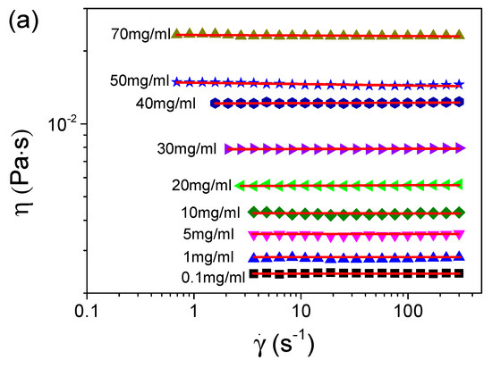 We first measured the viscosities of the S-PFSA dispersions through the steady shear approach. Figure 3 summarizes the viscosities of various S-PFSA dispersions as functions of the shear rate. The S-PFSA dispersions ranging from 0.1 to 70 mg/mL behaved as Newtonian fluids. In contrast, non-Newtonian behavior (also termed shear thinning) was observed as the S-PFSA content was increased to 80 mg/mL. The shear thinning became more pronounced with a further increase in the S-PFSA concentrations (c ≥ 100 mg/mL). The viscosity data can be fitted based on the Carreau model [48,49],