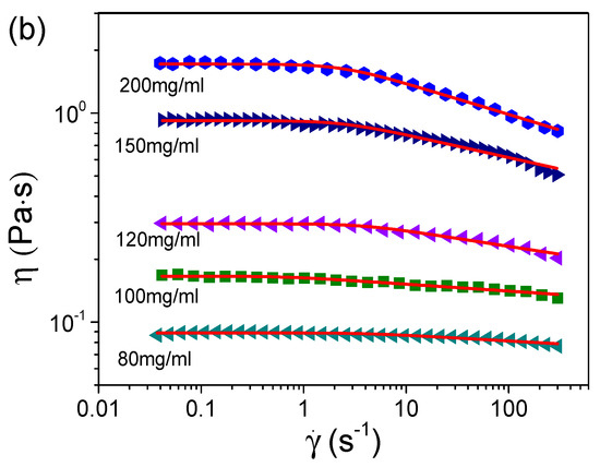 Dependence of viscosity on shear rate for S-PFSA dispersions with concentrations of (a) 0.1–70 mg/mL and (b) 80–200 mg/mL. These viscosity data were acquired by macrorheological measurements based on steady shear.