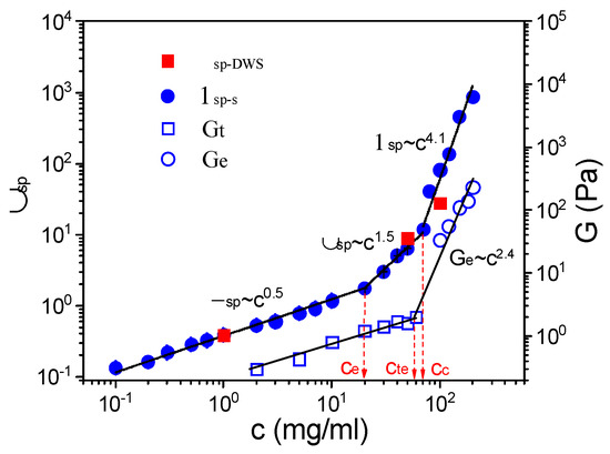 Dependence of ηsp, Ge, and Gt on S-PFSA concentration, where ηsp-s (filled circle) and ηsp-DWS (filled square) are obtained from macrorheology and DWS microrheology, respectively. The solid lines represent guides to the scaling relationships in semidilute unentangled regime (ηsp~c0.5), semidilute entangled regime (ηsp~c1.5), and concentrated regime (ηsp~c4.1).