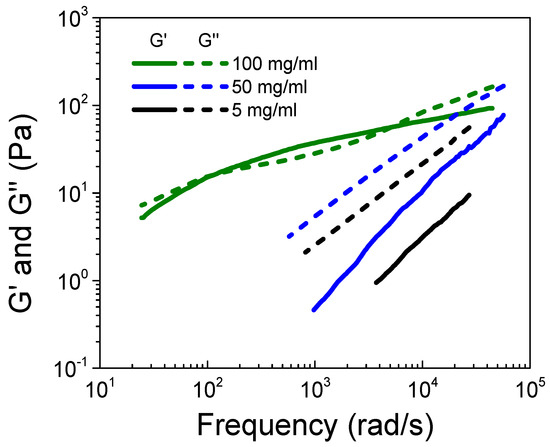 Storage modulus (G’) and loss modulus (G”) obtained from DWS microrheological measurements for the S-PFSA dispersions at 5, 50, and 100 mg/mL.