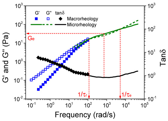 Frequency dependence of G’, G”, and tanδ for the S-PFSA dispersion of 100 mg/mL. The dot data were obtained from macrorheology, and the line data were measured by DWS microrheology. The red dashed arrows guide the determination of Ge, τr, and τe.