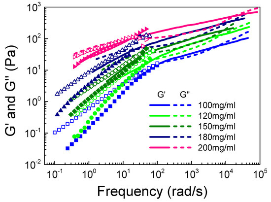 Frequency dependence of G’ and G” on S-PFSA concentration in the concentrated regime. The dot data were obtained from macrorheology, and the line data were measured by DWS microrheology.