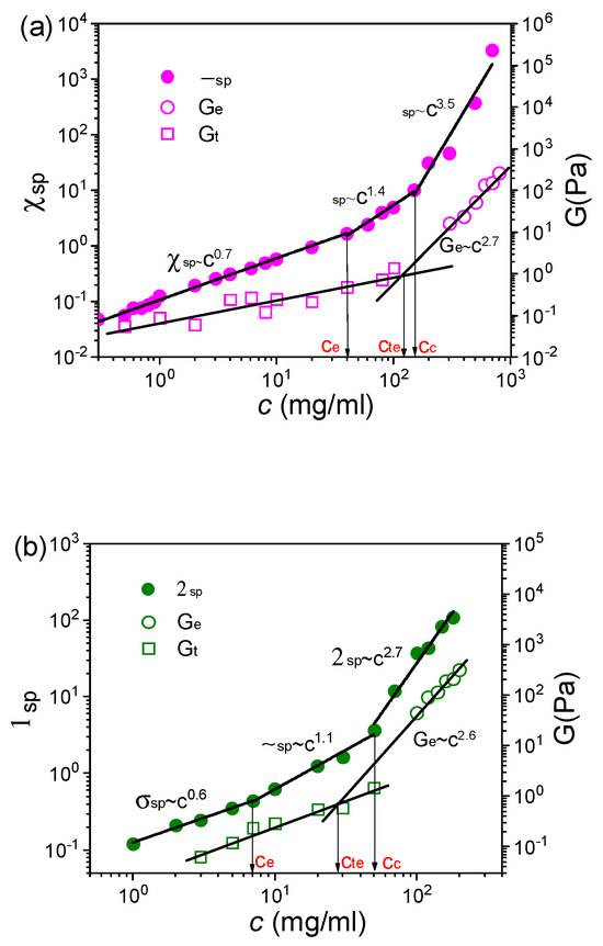 The relationships of ηsp, Ge, and Gt with c for (a) the L-PFSA dispersions in water/2-propanol and (b) the S-PFSA dispersions in water/ethanol.
