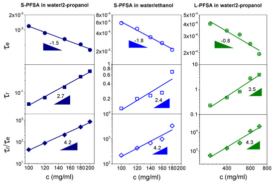 Dependence of τe, τr, and τr/τe on polymer concentration in the concentrated regime for the S-PFSA dispersions in water/2-propanol and water/ethanol as well as the L-PFSA dispersion in water/2-propanol.